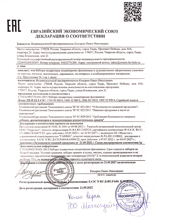 Барлық тәтті жаңа жылдық сыйлықтар үшін біз КО нормаларына сәйкестік декларациясын ұсынамыз.